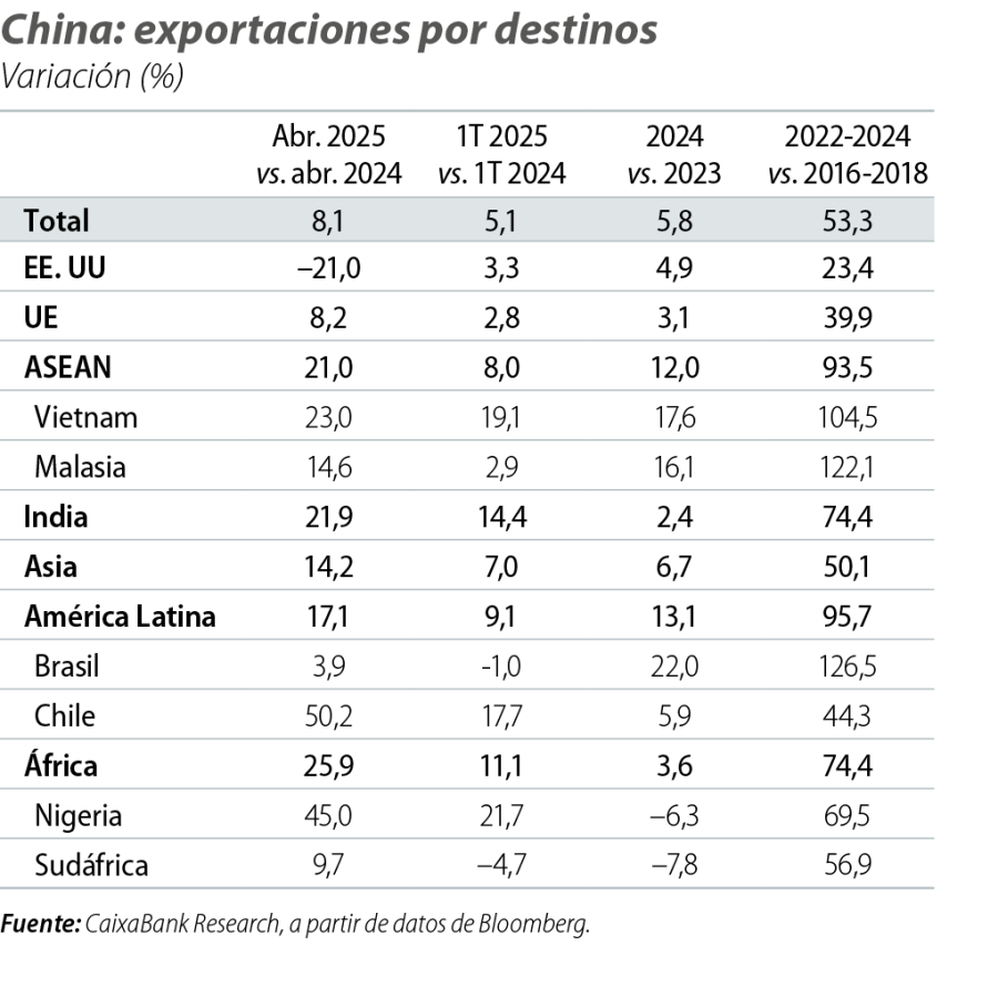 Gran parte de la atención está centrada hoy en China, que, con una estrategia de confrontación y repuesta de escalada proteccionista, ha logrado un resultado que no está muy alejado de los demás países: ha sorteado los aranceles más punitivos del 2 de abril y cuenta hasta el 12 de agosto para negociar con EE. UU. Aun así, la tregua bilateral no es sinónimo de paz y el nuevo equilibrio hacia donde se mueven las relaciones comerciales entre ambos países es frágil y todavía muy incierto. En primer lugar, dependerá de las negociaciones de EE. UU. con los mayores socios comerciales de China (UE y ASEAN), y en particular de la inclusión de reglas de origen que restrinjan la incorporación de valor añadido en China. En segundo lugar, estará condicionado por la eficacia del redireccionamiento de los flujos comerciales de China hacia otros países –por rerouting o por la búsqueda de nuevos mercados, como sucedió en el episodio previo de escalada proteccionista en 2018–.11 Por el momento, los pocos datos por ahora disponibles parecen confirmar un cambio de destino en las exportaciones chinas. Así, en abril, la caída de las ventas a EE. UU. se ha visto compensada por el aumento de las exportaciones hacia otros destinos, en particular ASEAN, pero también la India, América Latina y África (véase la tabla). En tercer lugar, será relevante el progreso en el cumplimiento de los objetivos principales de la política proteccionista de la Administración Trump, como la reducción del déficit comercial o el incremento en la recaudación por aranceles. Y, en cuarto lugar, el nuevo equilibrio dependerá de factores como la evolución de la competencia entre ambas potencias, en el ámbito tecnológico o financiero, y la capacidad de la economía china de reequilibrar su modelo de crecimiento. Las dependencias son mutuas y un buen ejemplo es el sector electrónico, en el que China se volvió la primera potencia manufacturera global, pero EE. UU. mantuvo un liderazgo tecnológico destacado.12
