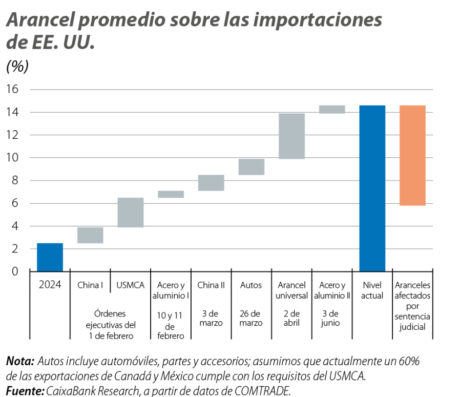 Después de las idas y venidas con los anuncios, suspensiones y exenciones por parte de la Administración Trump, estimamos que el valor promedio del arancel aplicado por EE. UU. habría aumentado algo más de 12 p. p. en lo que llevamos de 2025, situándose cerca del 15% (véase el primer gráfico). Estos niveles multiplican por cinco los vigentes desde el inicio de la escalada proteccionista en 2018 y se sitúan en valores desconocidos desde los años cuarenta del pasado siglo.1 Sin embargo, podemos decir que, por el momento, hemos esquivado una situación más adversa, ya que el valor actual es significativamente inferior al que se habría derivado de la aplicación íntegra de las medidas anunciadas el 2 de abril2 y al alcanzado una semana después en plena guerra comercial con China, en el que los aranceles mutuos superaron ampliamente el 100%. Como ingrediente adicional de incertidumbre, una sentencia reciente del Tribunal de Comercio Internacional de EE. UU. ha añadido dudas sobre la legalidad de las medidas generales aplicadas a los socios comerciales, que estimamos afectarían al equivalente de 9 p. p. del arancel promedio. Por el momento, una apelación del Gobierno mantiene las condiciones actuales en vigor a falta de una decisión en firme.