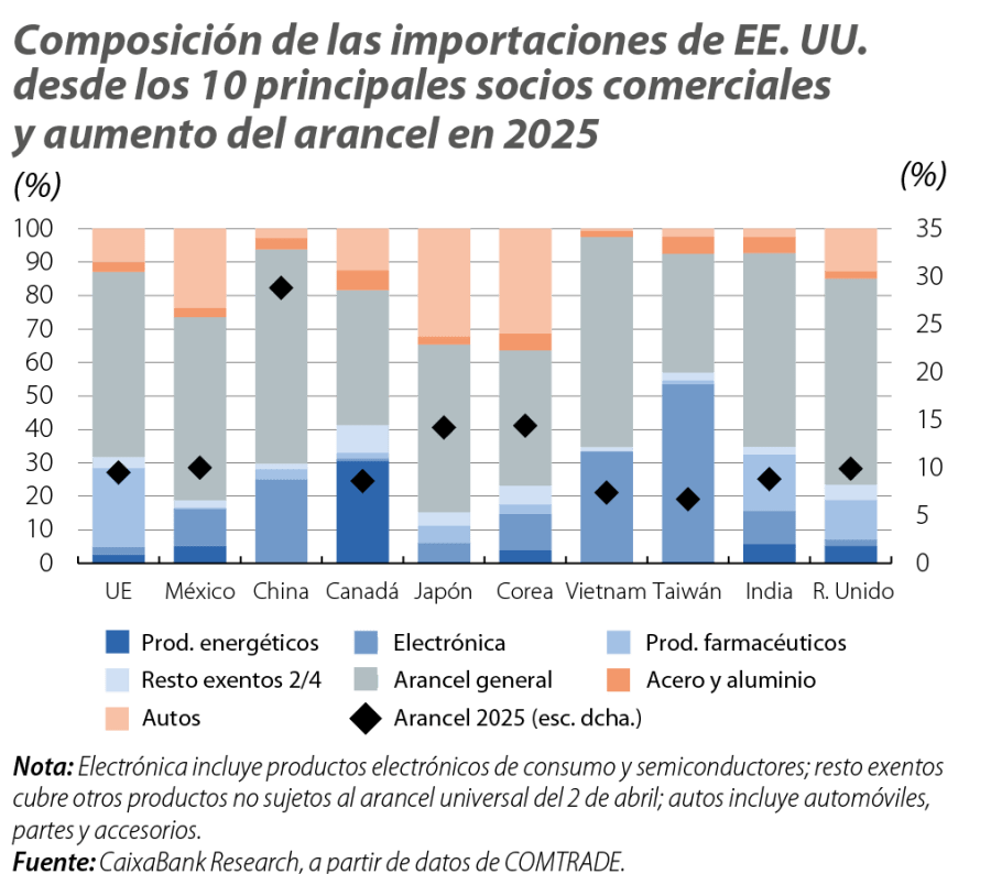 - 7En el caso de China, estos aranceles se aplican adicionalmente al incremento general de 20 p. p. acumulado en febrero y marzo, pero no al 25% sobre los productos de Canadá y México.