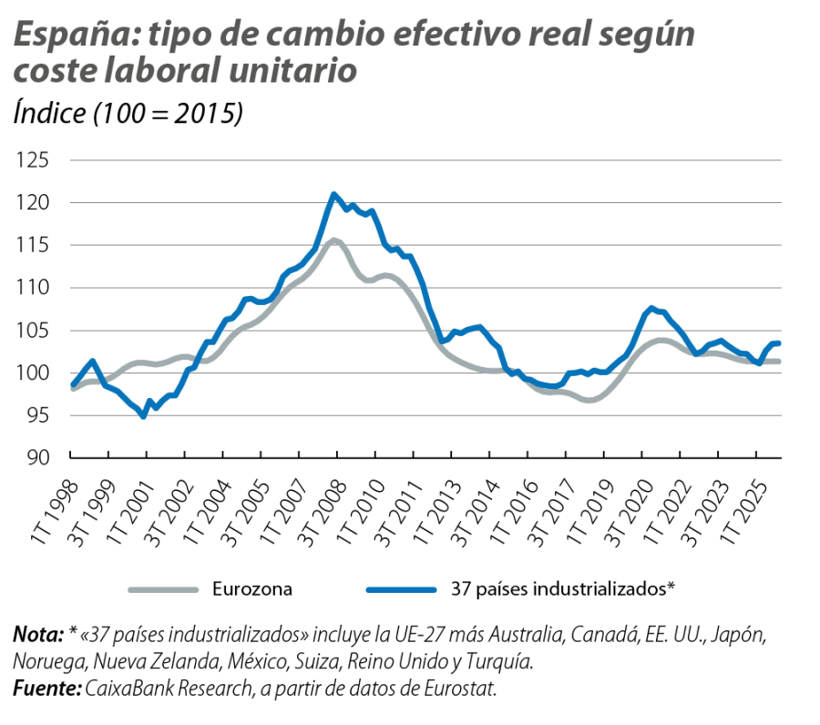 En el primer gráfico, comparamos el TCER frente a la eurozona y a un grupo de 37 países industrializados. En la comparación con la eurozona, al compartir moneda, el componente del tipo de cambio nominal no opera y la lectura equivale a comparar precios relativos. Tras un punto de inflexión en el último trimestre de 2022 (cuando la inflación en España subió menos que en otros países de la eurozona), vemos un modesto deterioro de competitividad hasta el último trimestre de 2025, que nos deja, no obstante, en un nivel aún más competitivo que el que teníamos en 2019. Frente al conjunto de 37 países, el repunte reciente del TCER es más marcado debido al impacto de la apreciación del euro. A pesar de ello, nos mantenemos en niveles comparables a los que teníamos antes de la pandemia.