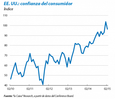 Los indicadores de actividad confirman la fortaleza del consumo. El índice de confianza del consumidor del Conference Board, rebasó en enero la referencia de los 100 puntos por primera vez desde noviembre de 2000 (la media histórica se sitúa en los 93 puntos), y pese al retroceso de febrero (hasta los 96,4 puntos), el indicador describe una marcada trayectoria de mejora sostenida. La debilidad de las ventas minoristas de enero, calculadas con precios corrientes, se debió, en gran parte, al bajo precio de los carburantes.