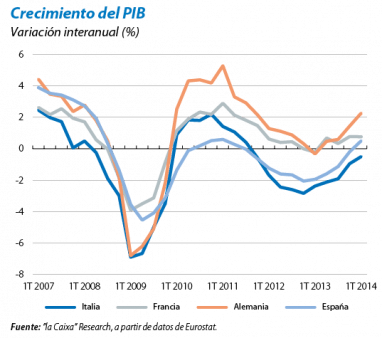 Aumentan las diferencias entre las principales economías de la eurozona. El PIB de la eurozona creció en el 1T 2014 un 0,2% intertrimestral, aunque las diferencias entre países son muy significativas. Sobresale el sorprendente avance del PIB de Alemania, con un 0,8% respecto al trimestre anterior, y de España, donde creció un 0,4%, mostrando cierta solidez en su recuperación económica. En el lado opuesto, destacan Francia e Italia, que volvieron a ofrecer registros peores de lo esperado, con un crecimiento nulo para los franceses y todavía en contracción para los italianos (–0,1% intertrimestral). Dichos resultados alimentan las dudas sobre la capacidad de crecimiento de estos dos países a medio plazo y el escepticismo en torno a las reformas estructurales implementadas y aquellas pendientes para reactivar el crecimiento de sus respectivas economías. Esta tendencia es también observada por la Comisión Europea (CE) en su informe de primavera. En sus previsiones de crecimiento para 2014 y 2015 se detectan claramente distintas velocidades entre los países de la eurozona. De cara a 2014, España crecerá a niveles similares a los de Francia, por delante de Italia. Para 2015 ya se espera que España crezca por encima de estas dos economías y a niveles cercanos a los de Alemania.