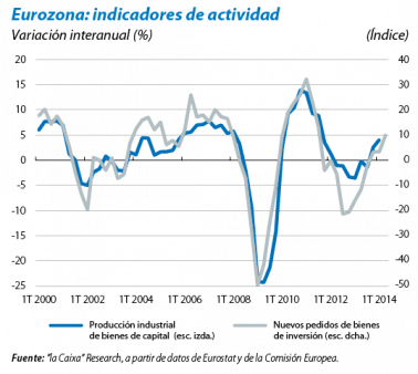 La inversión, factor clave de la recuperación. En el conjunto de la eurozona, la inversión lleva tres trimestres consecutivos marcando tasas de crecimiento intertrimestrales positivas, aunque fue en el 4T 2013 cuando empezó a ganar tracción, marcando un aumento del 1,0%. Varios indicadores avanzados, como la producción industrial de bienes de inversión y los nuevos pedidos de estos bienes, sugieren que la tendencia alcista se mantuvo en el 1T 2014 y que seguirá ganando fuerza a corto y a medio plazo. Para el conjunto del año y para 2015, la CE augura una mejoría notable, del 2,3% y 4,2% interanual, respectivamente. La mejoría de la confianza de los distintos agentes, la menor incertidumbre que rodea la crisis de deuda soberana y una gradual normalización de las condiciones crediticias son los principales factores sobre los que descansa la previsión de la CE, aunque también reconoce que los factores de riesgo siguen siendo numerosos.