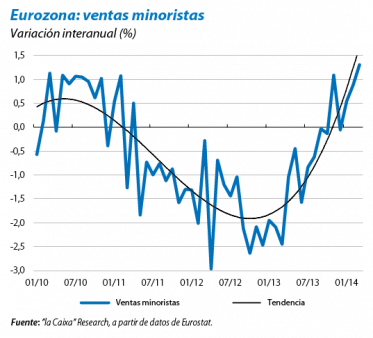 La mejora del consumo de los hogares, cada vez más convincente. Como la inversión, el consumo de los hogares empezó a registrar tasas de crecimiento positivas en el 2T 2013. Sin embargo, a diferencia de la inversión, la recuperación del consumo fue muy modesta hasta el 4T 2013 (último dato disponible), con un ritmo de avance que apenas alcanzó el 0,1% intertrimestral en promedio. De todas formas, los últimos indicadores avanzados sugieren que el ritmo de crecimiento podría estar empezando a aumentar. Un claro ejemplo de ello son las ventas minoristas, que en marzo anotaron un avance del 1,3% interanual, consolidando así una tendencia claramente ascendente. En conjunto, por tanto, la demanda interna parece que va ganando tracción y va reequilibrando las fuentes de crecimiento de la eurozona, hasta la fecha muy dependiente de la evolución del sector exterior.