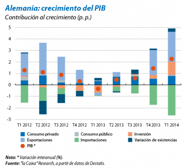 La economía alemana sigue liderando la recuperación económica europea. Las dinámicas antes destacadas para el conjunto de la eurozona, impulso de la demanda doméstica en general, y de la inversión en particular, son especialmente notorias en la economía alemana, para la que ya se conoce el detalle del PIB del 1T 2014. El ritmo de avance del PIB alcanzó el 2,3% interanual, y la inversión y el consumo de los hogares crecieron un 6,6% y un 1,4%, respectivamente. El mayor dinamismo de la demanda interna se tradujo en un repunte de las importaciones, hasta el punto de que la contribución del sector exterior al crecimiento fue nula. Un hecho de especial relevancia, tratándose de la economía germana, que hasta la fecha ha contado con el sector exterior como principal impulsor del PIB. Los últimos indicadores de más alta frecuencia, que en general han sido muy positivos, junto con los buenos datos de crecimiento del 1T 2014, es probable que propicien una revisión al alza del crecimiento previsto para la economía germana en 2014, que actualmente el consenso de analistas sitúa en el 1,9%.