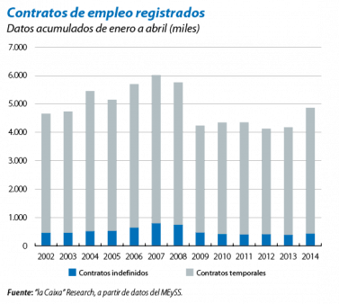 La recuperación del mercado laboral gana amplitud. Los afiliados a la Seguridad Social aumentaron por noveno mes consecutivo en mayo (56.600 personas, una vez corregidos los efectos estacionales). En general, la mejora del mercado laboral se ha concentrado en el sector servicios, pero la industria y la construcción también se sumaron a la creación de empleo este mes. Asimismo, las cifras de contratación reflejan la mejoría del mercado laboral. En concreto, el número total de nuevos contratos entre enero y abril de este año fue un 16,5% superior al registrado durante los mismos meses en 2013. Aunque la gran mayoría fueran temporales como es habitual, es destacable que los indefinidos crecieran a un ritmo más acelerado en marzo y abril tras la entrada en vigor de los nuevos incentivos a la contratación indefinida. En los próximos meses la continuidad de esta dinámica debería tener un impacto positivo en el empleo estable y ello debería ayudar a dinamizar el consumo privado. También ayudará el hecho de que, en el 2T 2014, las expectativas de desempleo para los próximos 12 meses, en –3,1 puntos, estén en cotas muy bajas, que no se observaban desde el año 2000.