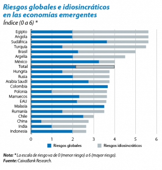 Pues bien, a nivel agregado, el riesgo promedio del grupo de emergentes analizados es 4,0, una cifra en la que el peso de los factores globales es algo más alto que el de los idiosincráticos (54% frente al 46%, respectivamente). Siendo esta la situación del conjunto, es interesante destacar que en los cinco países que acumulan un mayor nivel de riesgo se puede identificar una contribución de los factores idiosincráticos más elevada. Con todo, los factores globales también son relevantes.