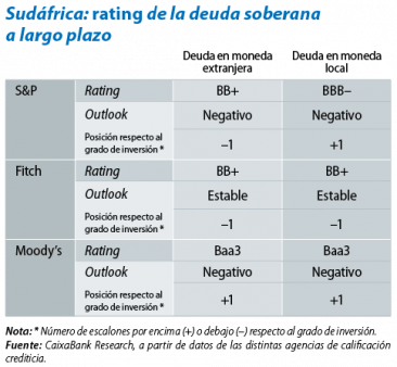 Así, el hecho de que la pérdida del grado de inversión se haya producido sobre la deuda en moneda extranjera y no sobre la deuda en rand (al menos en dos de las agencias más reputadas) es un alivio importante, por el momento. Sin embargo, para recuperar la confianza de los inversores, Sudáfrica debe presentar un plan de actuación que asegure la sostenibilidad de las finanzas públicas a medio plazo y una agenda de reformas estructurales que mejore las perspectivas de crecimiento.