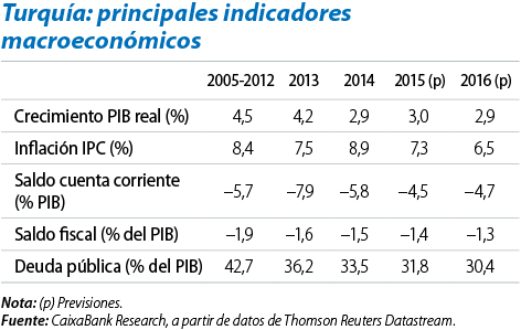 En los últimos cinco años, el crecimiento de Turquía ha sido notable, superior al 5% en promedio anual. Aunque en 2014 la economía se deslizó hacia el 3%, en el 2T 2015 el PIB creció un 3,8% interanual, lo que diferencia a Turquía de otros emergentes, como Brasil o Rusia, que han entrado en recesión. Sin embargo, la cifra de avance del PIB es elevada pero escasamente sólida, toda vez que es el resultado de un patrón de crecimiento poco sostenible. De entrada, porque, en no poca medida, la aceleración de la primera mitad de 2015 es el resultado de la plena materialización del descenso del precio del crudo (las importaciones de petróleo son abultadas, ya que ascienden al 6% del PIB). Pero, sobre todo, porque el fuerte crecimiento se ha visto acompañado por desequilibrios notorios en materia de déficit corriente (–5,9% del PIB en el 2T) e inflación (7,6% interanual en octubre). En este contexto, la política económica del país ha sido poco decidida. Aunque la disciplina fiscal se ha mantenido razonablemente firme, la política monetaria ha sido poco apropiada. A pesar de que el repunte de los precios ha alejado la inflación del objetivo del 5% del Banco Central de Turquía, el tipo de referencia ha pasado del 10% de mediados de 2014 al actual 7,5% (lo que implica un tipo de interés real negativo).