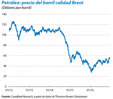 La economía mundial creció un 3,1% en 2016, un ritmo muy similar al de 2015 (3,2%). El año 2016 fue de menos a más, apoyado, sobre todo, por la aceleración de las economías emergentes en la segunda mitad del año, mientras que el crecimiento de las economías avanzadas, aunque significativo, se situó ligeramente por debajo del registrado en 2015. A nivel mundial, el avance económico se vio favorecido por el mantenimiento de una política monetaria muy acomodaticia por parte de los principales bancos centrales y por una ligera recuperación del precio del petróleo, que alivió las presiones financieras de varios países emergentes (exportadores de crudo), y que fue suficientemente suave como para no perjudicar a los países importadores. En este sentido, el acuerdo para reducir la producción de petróleo alcanzado por los países de la OPEP, y al que se sumaron los países no-OPEP (incluido Rusia), apoyará la continuidad de la recuperación de la cotización del petróleo (véase el Focus «Acuerdo de productores de petróleo: el retorno del cartel» en este Informe Mensual).