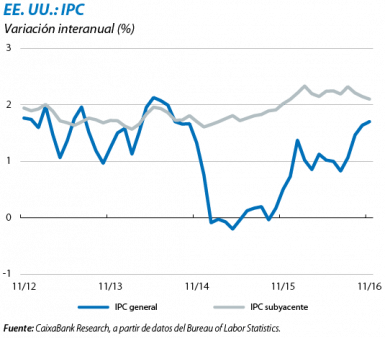 El IPC general de EE. UU. creció un 1,7% interanual en noviembre, 1 décima por encima del registro del mes anterior, aupado por el sólido avance del componente energético y por el crecimiento de los alquileres imputados, que tienen un peso importante en el IPC estadounidense. La recuperación de la inflación seguirá apoyada por la buena marcha del consumo, el cual, a su vez, se verá favorecido por la solidez del mercado laboral. En noviembre, se crearon 178.000 puestos de trabajo, la tasa de paro bajó hasta el 4,6% y los salarios avanzaron un considerable 2,5% interanual. Asimismo, la medida más amplia de desempleo realizada por el Bureau of Labor Statistics, la U6 (que contabiliza como paradas a las personas que trabajan a tiempo parcial pero que querrían hacerlo a tiempo completo), también bajó hasta el 9,3%, por encima del 8% alcanzado en 2006 y 2007, pero claramente por debajo del promedio histórico. No es extraño, por tanto, que la Fed en su comunicado de diciembre indicara que la subida de tipos había decidido realizarla por «las condiciones ocurridas y esperadas de la inflación y del mercado laboral».
