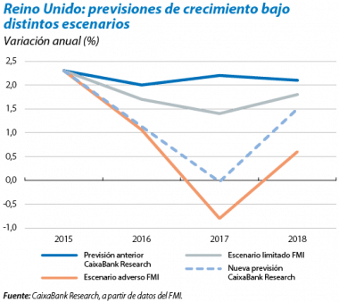 Apreciable impacto económico del brexit para el Reino Unido a corto plazo. Es probable que el Reino Unido caiga de manera inminente en recesión por la elevada incertidumbre, que frenará las decisiones de inversión, contratación y consumo. Su magnitud y profundidad dependerán de cómo vaya evolucionando la incertidumbre generada. De aumentar esta, se elevará la presión para buscar una salida que no sea una ruptura radical con la situación actual. Prevemos que la economía empiece a normalizarse a medida que se inicien las negociaciones con la UE, probablemente a finales de 2016 o inicios de 2017. De momento, el Banco de Inglaterra ha inyectado liquidez adicional y podría recortar los tipos de interés próximamente. A largo plazo, el coste del brexit dependerá en gran medida de cómo se articule la nueva relación con la UE, en particular los acuerdos comerciales y de circulación de personas, y con otros países (véase para más detalle el Focus «Brexit: una apuesta con más costes que beneficios» en el IM05/2016). Las estimaciones del coste en términos de nivel del PIB por parte de varios organismos fluctúan entre un –1% y un –10%.