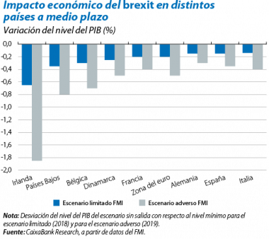 Las consecuencias económicas para el resto de países miembros deberían ser moderadas. El brexit tendrá un impacto directo (a través del canal comercial) en el resto de socios comunitarios debido a la recesión del Reino Unido, y uno indirecto, por el repunte de la incertidumbre. Sin embargo, el efecto agregado debería ser modesto, equivalente a unas pocas décimas para la mayoría de países. La repercusión en algunas economías como Irlanda o los Países Bajos será mayor debido a los fuertes vínculos de estas con el Reino Unido. El deterioro macroeconómico podría ser más acusado si se degrada la cohesión política en el seno de la UE, si las políticas económicas (monetaria, fiscal, etc.) perdiesen efectividad o si se materializaran otros riesgos externos, tanto geopolíticos como económicos.