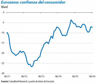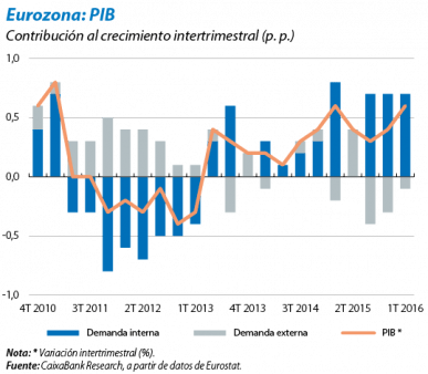 La economía de la eurozona, en condiciones de resistir el shock. El contexto en el cual se produce el shock económico del brexit es, con todo, relativamente positivo. La eurozona sumó en el 1T 2016 su decimotercer trimestre consecutivo con avances del PIB (que han permitido recuperar el nivel de PIB real previo a la crisis de 2008). Concretamente, en dicho 1T, el incremento intertrimestral del PIB fue del 0,6%, ligeramente superior respecto al 0,4% del 4T 2015. Además de su ritmo de actividad favorable, cabe destacar la equilibrada composición del crecimiento. La demanda interna continuó siendo la principal contribuidora a la variación del PIB (+0,7 p. p.), en particular, gracias al consumo privado (+0,3 p. p.), cuya aportación aumentó. El consumo público y la inversión contribuyeron, respectivamente, con +0,1 p. p. y +0,2 p. p. y, junto con el consumo privado, es probable que sean los pilares del crecimiento de la eurozona en los próximos meses. Dado el carácter inercial que acostumbra a exhibir la demanda interna, su fortaleza provee de cierto margen de autonomía al ciclo de los países de la moneda única respecto a los canales económicos más directos por los que el brexit se transmitirá. Por su parte, la demanda externa redujo su contribución negativa al crecimiento en el 1T (–0,1 p. p.), a causa, sobre todo, del menor avance de las importaciones con respecto al de las exportaciones.