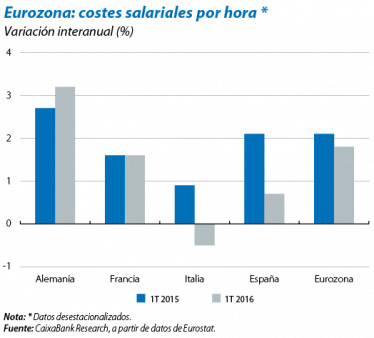 Una mejora del mercado laboral moderada pero continuada. La expansión del consumo se ampara, en gran medida, en la continuada expansión del mercado laboral. En el 1T 2016 se mantuvo en la eurozona un ritmo de creación de la ocupación equivalente a la del segundo semestre de 2015 (0,3% intertrimestral). La tasa de paro, por su parte, se situó en abril en el 10,2% de la población activa, su mínimo desde principios de 2011. Por lo que se refiere a los costes salariales, en el 1T 2016 el crecimiento interanual fue del 1,8%. Aunque se trata de una cierta aceleración respecto al 1,5% interanual del 3T y del 4T 2015, el ritmo de avance es inferior al registrado un año antes, cuando fue del 2,1%, y, en todo caso, es consistente con el proceso de expansión económica que la eurozona está viviendo. Cabe señalar que el proceso de aumento de los costes salariales está siendo notablemente dispar por países. Mientras en Alemania crecieron un 3,2% interanual en dicho 1T, en España el incremento fue un más moderado (del 0,7%). Con todo, la dinámica más contenida es la italiana, país que registró una caída de los costes salariales del 0,5%.
