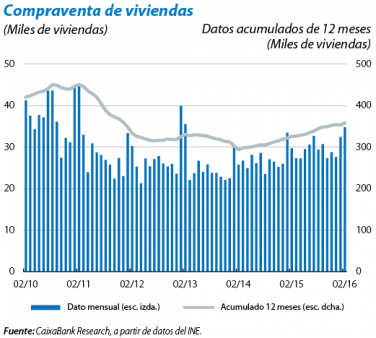 La mejora de la calidad de los balances bancarios también se refleja en la buena evolución del mercado inmobiliario. Tanto la notable creación de empleo, que ha sido clave para aumentar el poder adquisitivo de las familias, como la relajación de los criterios de aprobación de los créditos por parte de los bancos han impulsado las compraventas de viviendas. En concreto, estas últimas crecieron un 9,9% interanual en febrero (en el acumulado de 12 meses) y se situaron a niveles similares a los del inicio de 2012. Cabe señalar que la presión sobre los precios es muy distinta entre regiones, puesto que también lo son el stock de vivienda nueva por vender y el crecimiento de las compraventas.