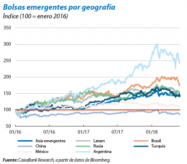 Los mercados financieros emergentes digieren el endurecimiento de las condiciones financieras globales. Por segundo mes consecutivo, las cotizaciones financieras emergentes se vieron penalizadas por la consolidación de un entorno de mayores tipos de interés en EE. UU. Por un lado, en el mercado de divisas, el dólar ganó fuerza y prácticamente todas las monedas emergentes se depreciaron marcadamente y perdieron los avances conseguidos desde enero de 2018 (de hecho, entre las principales divisas, solo las de Colombia, Tailandia, China y Malasia se mantienen en positivo en lo que va de año, frente a las 18 que lo conseguían hace dos meses). Por otro lado, las bolsas emergentes también sufrieron y la mayoría de índices cerraron el mes con pérdidas significativas (el índice de MSCI para el conjunto de los emergentes retrocedió más de un 3%). Por regiones, la más penalizada fue América Latina, cuyo índice MSCI perdió un 14,3%, lastrado especialmente por el retroceso del 7,5% de la bolsa mexicana, mientras que el índice MSCI para el conjunto de las bolsas asiáticas emergentes registró pérdidas en torno al 1,5%.