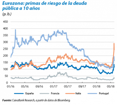Europa se ve arrastrada por un episodio de aversión al riesgo. Siguiendo la estela de las bolsas estadounidenses, durante las primeras semanas del mes, los principales índices bursátiles europeos exhibieron un tono positivo y registraron avances superiores al 2% en España y Francia, y cercanos al 5% en Alemania. Esta buena dinámica, sin embargo, terminó abruptamente en la segunda mitad del mes, cuando la incertidumbre alrededor de la formación de gobierno en Italia provocó un fuerte repunte de la aversión al riesgo. Así, la prima de riesgo italiana rebotó en 170 puntos hasta los 300 p. b. (nivel que no se alcanzaba desde la crisis de la deuda soberana en 2012), para cerrar el mes en 245 p. b. Esto generó cierto contagio al resto de primas de riesgo periféricas (la española pasó de los 70 p. b. hasta los 136 p. b. y cerró en los 116 p. b., y la portuguesa repuntó desde los 110 p. b. hasta los 193 p. b. y cerró en los 164 p. b.), mientras que la deuda soberana de Alemania actuó como activo refugio y su yield a 10 años disminuyó en casi 40 p. b., aunque recuperó algo de terreno en los últimos días del mes. Ante este episodio, las bolsas empezaron a sufrir unas pérdidas acumuladas importantes que fueron más acusadas en la periferia (con retrocesos superiores al 7%) que en el núcleo. Así, en el conjunto del mes, las bolsas europeas no consiguieron cerrar en positivo, con pérdidas mínimas en Alemania (índice DAX –0,1%) y mayores retrocesos en Francia (índice CAC –2,2%), España (Ibex 35 –5,2%) e Italia (índice MIB –9,2%). Finalmente, en el mercado de divisas, el euro también se resintió de la aversión al riesgo y, tras haber empezado el mes alrededor de 1,20 dólares por euro, se depreció hasta los 1,16 dólares al cierre del mes.