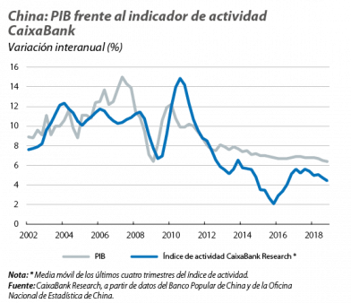 China despide 2018 confirmando el enfriamiento de su economía. Concretamente, el crecimiento del PIB alcanzó el 6,4% interanual en el 4T 2018, lo que situó el cómputo para el conjunto del año en el 6,6%, un registro en línea con el objetivo del Gobierno y nuestras previsiones. Aunque los datos oficiales siguen mostrando una desaceleración gradual de la economía, fruto de su transición económica hacia un mayor peso del sector terciario, índices de actividad alternativos (incluyendo el de CaixaBank Research, como muestra el penúltimo gráfico), junto con otros indicadores como las exportaciones (que cayeron un 4,4% interanual en diciembre) o el índice de sentimiento empresarial PMI (que en diciembre se situó en los 49,4 puntos, su registro más bajo en casi tres años), sugieren que la desaceleración del crecimiento podría ser más pronunciada de lo que indican los datos oficiales y que se podría haber visto afectada por las tensiones comerciales con EE. UU. y los aranceles sobre las importaciones chinas impuestos por la Administración estadounidense (que han empezado a afectar de forma significativa al sector exportador chino). De cara a 2019, esperamos que la desaceleración continúe, aunque de forma gradual, gracias a la implementación de nuevas medidas de estímulo por parte del Gobierno chino, como una mayor inversión pública en infraestructuras.