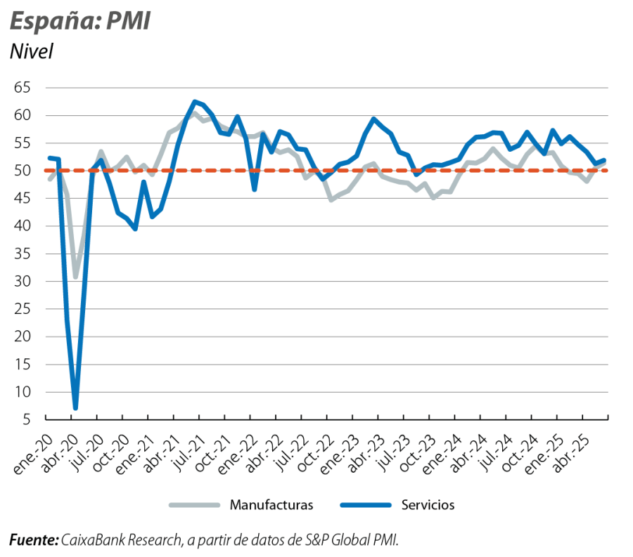 Los indicadores relacionados con el empleo y el consumo han sido positivos en el 2T. El crecimiento del empleo, medido por el número de trabajadores afiliados a la Seguridad Social, mantuvo un ritmo robusto y aumentó en el 2T un 0,6% intertrimestral (corregido por la estacionalidad), el mismo ritmo que en el trimestre anterior. Además, la cifra total de afiliados ascendió a 21.861.095 trabajadores, nueva cifra récord, y 468.206 más que hace un año. Por otra parte, el indicador de consumo doméstico del Monitor de CaixaBank Research ha mostrado en el 2T ritmos interanuales de crecimiento mayores que en el 1T. En cuanto a los índices de sentimiento empresarial, junio fue un buen mes: el PMI de manufacturas volvió a situarse por segundo mes consecutivo en zona expansiva (por encima de los 50 puntos), concretamente en los 51,4 puntos, por encima de los 50,5 puntos de mayo. Por su parte, el PMI de servicios se situó en junio en los 51,9 puntos, algo por encima de los 51,3 puntos de mayo. Considerando el conjunto de datos disponibles, el crecimiento intertrimestral del PIB se podría situar en torno al 0,5% en el 2T. La primera estimación del dato de PIB del 2T se publicará el 29 de julio, después del cierre de esta edición.