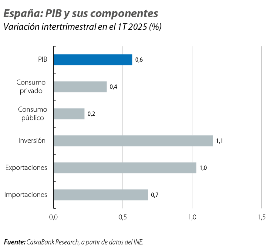 Durante el 1T 2025, el PIB creció un 0,6% intertrimestral, un ritmo de crecimiento 1 décima inferior al del trimestre anterior. De este modo, la economía española se sigue mostrando resiliente en un entorno cada vez más desfavorable. El desglose por componentes muestra un sólido patrón de crecimiento, con una aportación de la demanda interna de 0,4 p. p. al crecimiento del PIB trimestral y de 0,2 p. p. de la demanda externa tras dos trimestres de contribuciones negativas. Por el lado de la demanda interna, destacó el avance del 1,1% intertrimestral de la inversión pese al contexto de mayor incertidumbre, mientras que el consumo privado creció un 0,4% intertrimestral. Por el lado de la demanda externa, las exportaciones crecieron a mayor ritmo que las importaciones, impulsadas por las exportaciones de los servicios no turísticos. El dato de PIB del 1T está en consonancia con nuestras previsiones, que ya incorporaban una leve desaceleración derivada del aumento de la incertidumbre a causa de las tensiones comerciales.