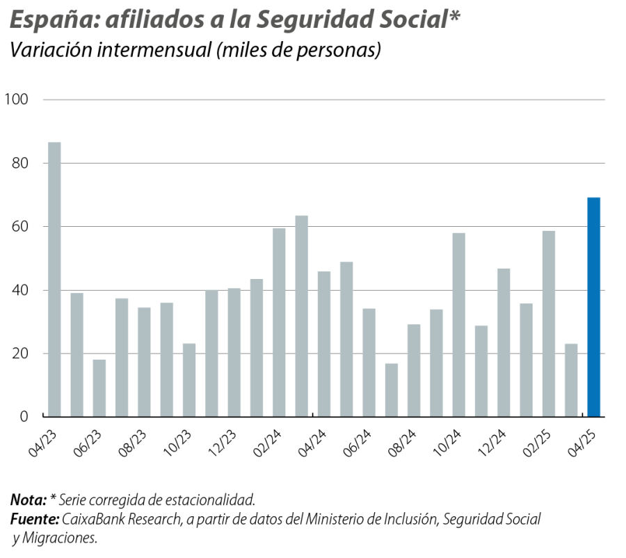 Los principales indicadores de actividad siguen marcados por una brecha entre el sector servicios y el manufacturero, más afectado por las tensiones comerciales. Por un lado, el índice PMI para el sector servicios se situó en los 54,7 puntos en abril, un registro por encima del umbral que indica crecimiento en el sector (50 puntos), aunque algo inferior a los 56,2 puntos del mes anterior. Por otro lado, el índice PMI para el sector manufacturero volvió a sufrir un retroceso al marcar 48,1 puntos, manteniéndose por debajo del umbral de los 50 puntos por segundo mes consecutivo. Las empresas encuestadas señalan el impacto derivado de las políticas arancelarias estadounidenses como uno de los factores que subyacen al deterioro. Finalmente, el consumo se mantuvo robusto en abril al crecer un 3,9% interanual, según datos del monitor de consumo de CaixaBank Research. Sin embargo, el dato está ligeramente sesgado al alza por la Semana Santa, que este año tuvo lugar en abril y el año pasado en marzo. De todas formas, si tomamos como referencia el crecimiento promedio de los últimos dos meses, el crecimiento se sitúa en el 3,6%, un ritmo de crecimiento algo superior al del 1T.