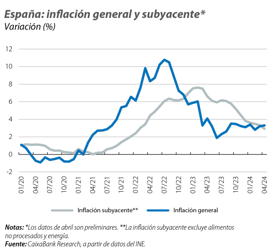 En abril, la inflación general retomó su tendencia a la baja al caer 1 décima hasta el 2,2%, según el indicador adelantado publicado por el INE. Este supuso el segundo descenso después del repunte inflacionista que tuvo lugar entre los meses de septiembre y febrero, y respondió principalmente a la caída de los precios de la electricidad y de los carburantes. Sin embargo, la inflación subyacente, que excluye energía y alimentos no elaborados, repuntó 4 décimas hasta el 2,4%. Esta subida podría responder a la Semana Santa, que este año tuvo lugar en abril (mientras que en 2024 fue en marzo), y en este periodo normalmente se produce un repunte puntual del precio de los servicios turísticos.