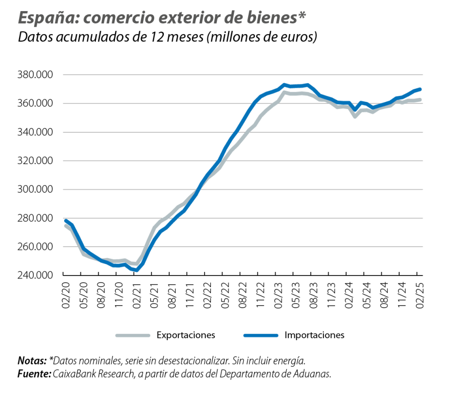 El sector exterior acusa un ligero empeoramiento en un entorno marcado aún por la debilidad de la eurozona y por la incertidumbre respecto a la política comercial. Así, en febrero el déficit comercial ascendió a –3.959 millones de euros frente a los –2.233 millones de febrero del año pasado, impulsado por unas importaciones que avanzaron un 3,5% interanual, mientras que las exportaciones apenas lo hicieron un 0,4%. Estas últimas se vieron lastradas por el retroceso en el sector energético y automovilístico, especialmente hacia Francia, Alemania, Italia y Reino Unido. El aumento del déficit comercial contrasta con el superávit en la exportación de servicios del 6,7% del PIB (acumulado de 12 meses), impulsada principalmente por los buenos datos de exportaciones turísticas.