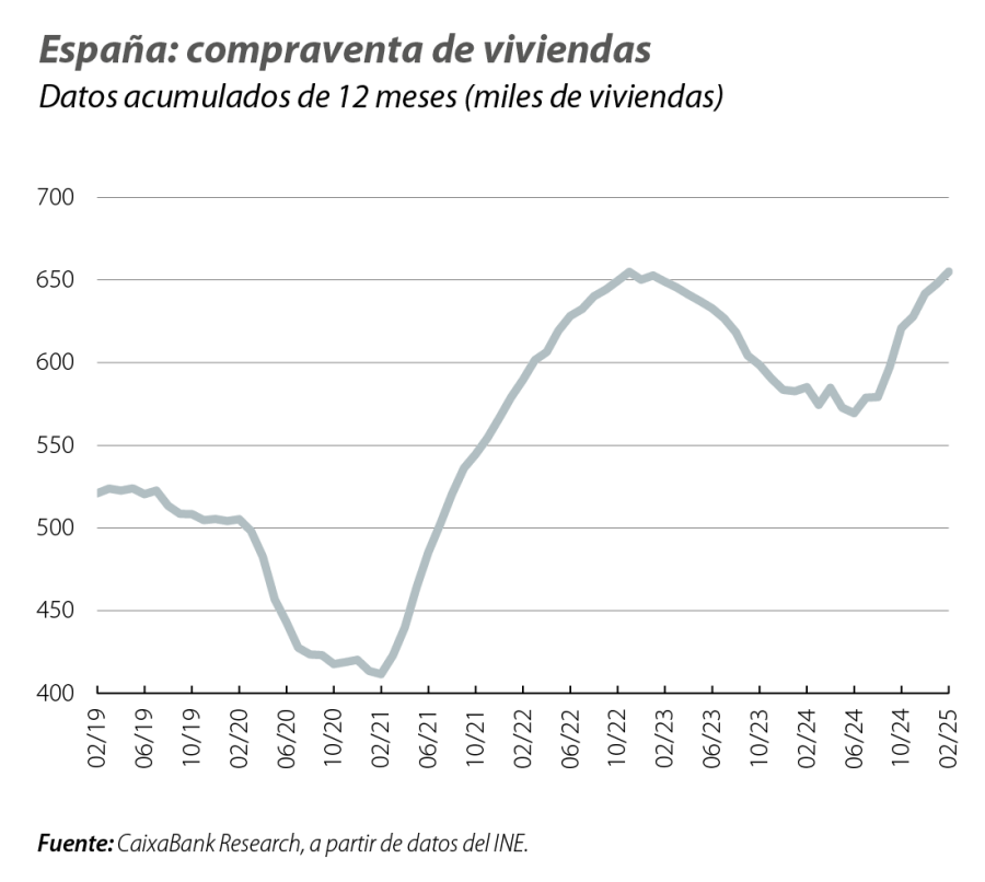 En febrero, las compraventas de vivienda crecieron un 13,9% interanual, un crecimiento 2,9 p. p. superior al de enero. Este crecimiento responde a un aumento generalizado de la actividad tanto en vivienda nueva como de la usada, que aumentaron un 22% y un 12% interanual, respectivamente. De este modo, en los dos primeros meses del año se han cerrado 120.300 transacciones, el mayor volumen de actividad en dicho periodo desde 2007. Por regiones y en el acumulado del año, los mayores incrementos se registraron en Asturias, La Rioja y Castilla-La Mancha, con crecimientos superiores al 20% interanual. Andalucía fue el único de los grandes mercados donde las compraventas crecieron por encima de la media.