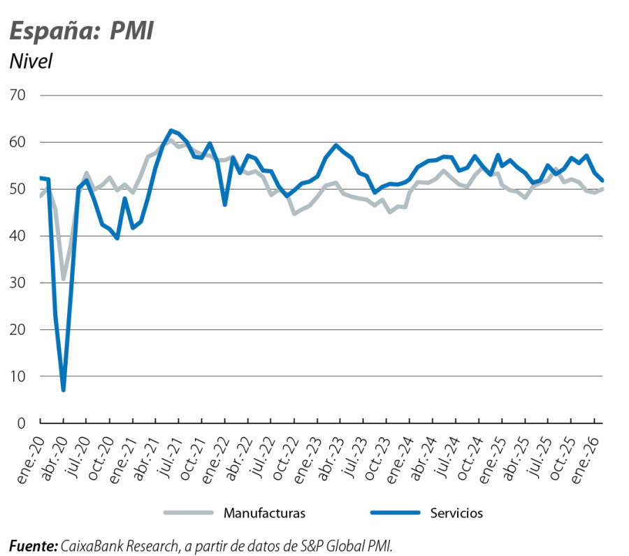 Por el lado de la oferta, los índices PMI también sugieren que el ritmo de crecimiento sigue siendo positivo y relativamente dinámico, aunque probablemente algo más moderado. Por un lado, el PMI manufacturero parece haber tocado fondo tras varios meses de debilitamiento, aunque sigue en registros relativamente bajos. Concretamente, en febrero se situó en los 50 puntos, un nivel que suele delimitar la zona expansiva de la contractiva y que es ligeramente superior al registro de enero. Sin embargo, el promedio en el 1T se sitúa en los 49,6 puntos, claramente por debajo de los 51,1 puntos del 4T 2025. El índice PMI de servicios también se está debilitando respecto a los registros con los que finalizó 2025. En febrero, se situó en los 51,9 puntos, lo que deja el promedio en lo que llevamos de 1T 2026 en 52,7 puntos, claramente por debajo de los registros con los que cerró 2025.