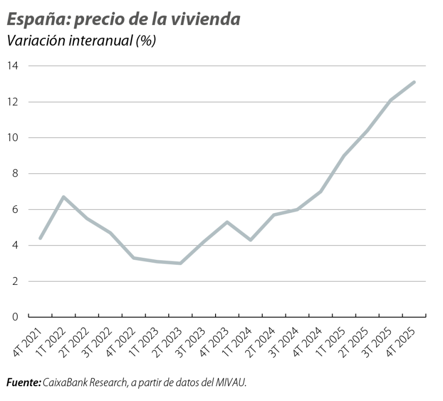 De todas formas, la presión de la demanda continúa trasladándose a los precios en un contexto en el que la oferta crece a un ritmo más moderado. El valor tasado de la vivienda libre del MIVAU avanzó un 13,1% interanual en el 4T, el mayor incremento del ciclo actual. Aunque los precios alcanzan nuevos máximos nominales, en términos reales se mantiene todavía un 25% por debajo de los niveles de 2007. En conjunto, los datos recientes refuerzan un escenario caracterizado por el déficit estructural de vivienda, que probablemente seguirá ejerciendo presión sobre los precios.