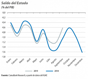 La ejecución presupuestaria muestra poco avance en la consolidación de las cuentas públicas. Así, en agosto de 2019, el déficit de las Administraciones públicas (excluyendo las corporaciones locales) fue ligeramente superior al registro de agosto de 2018 y se situó en el 2,1% del PIB (+0,1 p. p.). Este resultado se debió, principalmente, al deterioro de las cuentas de la Seguridad Social y las comunidades autónomas, que experimentaron déficits del 0,5% y del 0,2% del PIB, respectivamente. Por su parte, el déficit del Estado, del que ya se disponen datos hasta septiembre, se situó en el 0,6% del PIB, por debajo del 1,1% registrado en septiembre de 2018. Esto apunta a una ligera mejora en la ejecución presupuestaria en el final de año, aunque esta reducción no sería suficiente para conseguir compensar el desfase de la Seguridad Social y las comunidades autónomas para el objetivo de déficit para el conjunto de las Administraciones públicas en 2019 (2,0%). Este objetivo está incluido de nuevo en la actualización de las cuentas públicas que el Gobierno remitió a Bruselas en octubre. Este Plan Presupuestario incluye un escenario inercial para 2020, sin medidas de ingresos adicionales previstas y con solo el aumento de las pensiones (+0,9%) y del salario de los funcionarios (+2,0%) como medidas de gasto adicionales incluidas en 2020. Para ese año, el Gobierno prevé un déficit del 1,7%, 3 décimas por debajo de lo previsto por CaixaBank Research.