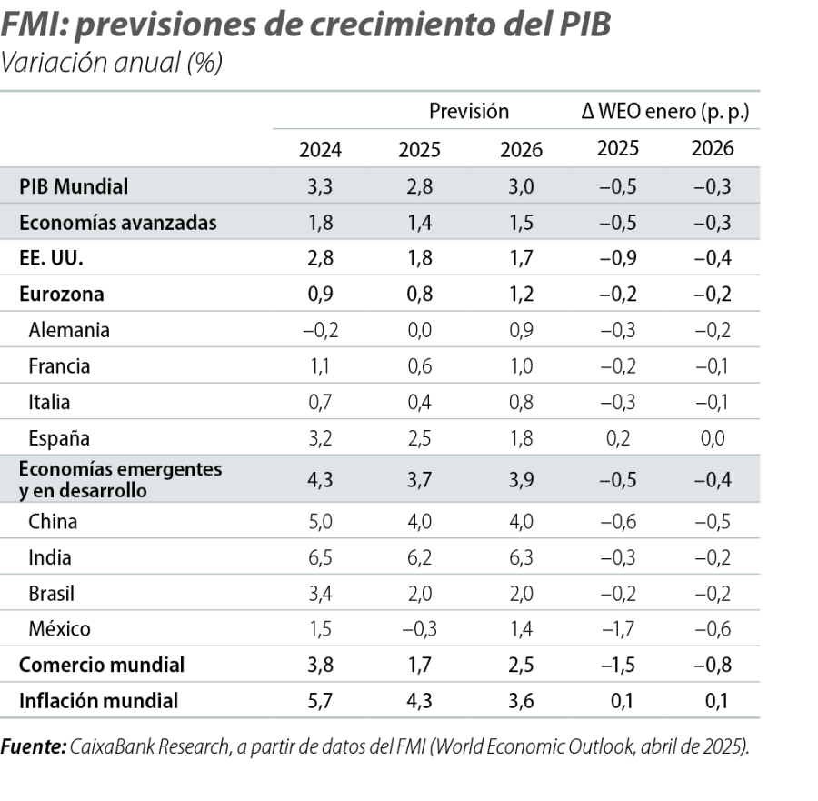 En su informe de previsiones de primavera, el FMI remarcó que los aranceles son un shock de oferta para el país que los aplica y de demanda para el que los soporta. En consecuencia, el impacto es claramente negativo sobre el crecimiento global, si bien del lado de la inflación actúan fuerzas en sentidos opuestos. Así, el FMI revisó su previsión de crecimiento para EE. UU. al 1,8% para 2025 y al 1,7% para 2026 (–0,9 p. p. y –0,4 p. p., respectivamente, con respecto a la previsión anterior), mientras que para la eurozona el ajuste fue más modesto, al 0,8% para 2025 y al 1,2% para 2026 (–0,2 p. p. con respecto a la previsión anterior). El crecimiento de China se situaría en el 4,0% (–0,6 p. p. y –0,5 p. p.). El FMI revisó también al alza la previsión de inflación global en 2025 y 2026, hasta el 4,3% y 3,6% (+ 0,1 p. p.), respectivamente. Para 2025, se prevé una inflación del 3,0% para EE. UU. (vs. 1,9% anterior), 2,1% para la eurozona (vs. 2,0% anterior) y 0,0% para China (vs. 1,7% anterior). Además, se señala que los aranceles puedan tener un impacto negativo en crecimiento también a medio plazo, al reducirse la innovación y la competencia. Entre perspectivas de crecimiento más bajo y el aumento de los costes de financiación y del gasto público en defensa, el FMI prevé que la deuda pública podría superar el 100% del PIB a finales de la década.