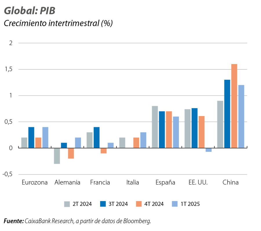 En la eurozona, el PIB creció un 0,4% intertrimestral en el 1T 2025 (vs. 0,2% en el trimestre anterior) y situó la tasa de crecimiento interanual en el 1,2%. Si las importaciones han sido un viento de cara en EE. UU., los últimos datos apuntan a que las exportaciones han sido un viento de cola de este lado del Atlántico. Todas las grandes economías, a excepción de España (véase la Coyuntura de Economía Española en este informe), han acelerado su crecimiento este trimestre, particularmente Alemania (creció un 0,2% intertrimestral vs. –0,2% anterior); Francia creció un 0,1% (vs. –0,1% anterior) e Italia un 0,3% (vs. 0,2% anterior). En China, el PIB creció un 1,2% intertrimestral en el 1T (vs. 1,6% en el 4T) y la tasa interanual se mantuvo en el 5,4%. A pesar de la desaceleración, el ritmo de crecimiento se ha mostrado robusto, en un trimestre en el que las exportaciones se han acelerado y el apoyo de la política fiscal ha ayudado a una expansión del consumo privado.