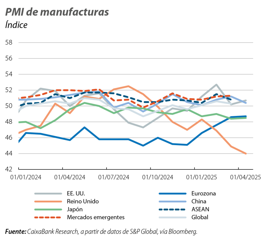 En la eurozona, el PMI compuesto cayó en abril, hasta 50,1 (vs. 50,9 anterior), una caída también explicada por el deterioro del componente de servicios, aunque el indicador compuesto ha logrado mantenerse por cuarto mes consecutivo por encima del umbral de 50 puntos. En positivo, la economía alemana muestra señales consistentes de mejora en el inicio de año: la evolución del índice Ifo de clima industrial consolidó en abril la subida anotada el mes previo (+0,2 puntos, hasta 86,9). En China, el PMI manufacturero oficial se situó en los 49,0 puntos (vs. 50,5 en marzo), una fuerte caída intermensual y que sitúa el indicador en un mínimo desde finales de 2023. La caída del PMI manufacturero Caixin fue más moderada (de 51,2 puntos en marzo a 50,4 en abril), pero ambos apuntan a una desaceleración marcada del sector manufacturero, con descensos particularmente visibles en los subcomponentes de nuevos pedidos.