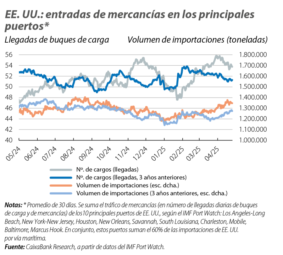 Los días caóticos tras el anuncio de los aranceles «recíprocos» por parte de la Administración estadounidense, lanzaron temores de fuertes turbulencias en los flujos comerciales. Aunque es probable que se observe una reducción material en los flujos de bienes en los próximos meses, particularmente en el eje EE. UU.-China, el impacto es todavía limitado. De hecho, entre finales de enero e inicio de abril, se ha observado un repunte en las llegadas de buques de carga y en el volumen de importaciones a los principales puertos estado-unidenses, una clara anticipación por parte de los importadores estadounidenses a los anuncios de aranceles. Por otro lado, se observan oscilaciones en los fletes. Desde el inicio de abril, el precio de enviar un contenedor desde Ho Chi Minh (Vietnam) a Los Ángeles (el mayor puerto estadounidense y mayor punto de entrada de mercancías desde Asia) ha aumentado un 60%, mientras que el precio desde Shanghái, tras un breve repunte, se ha mantenido en un nivel cercano a lo observado hasta marzo.