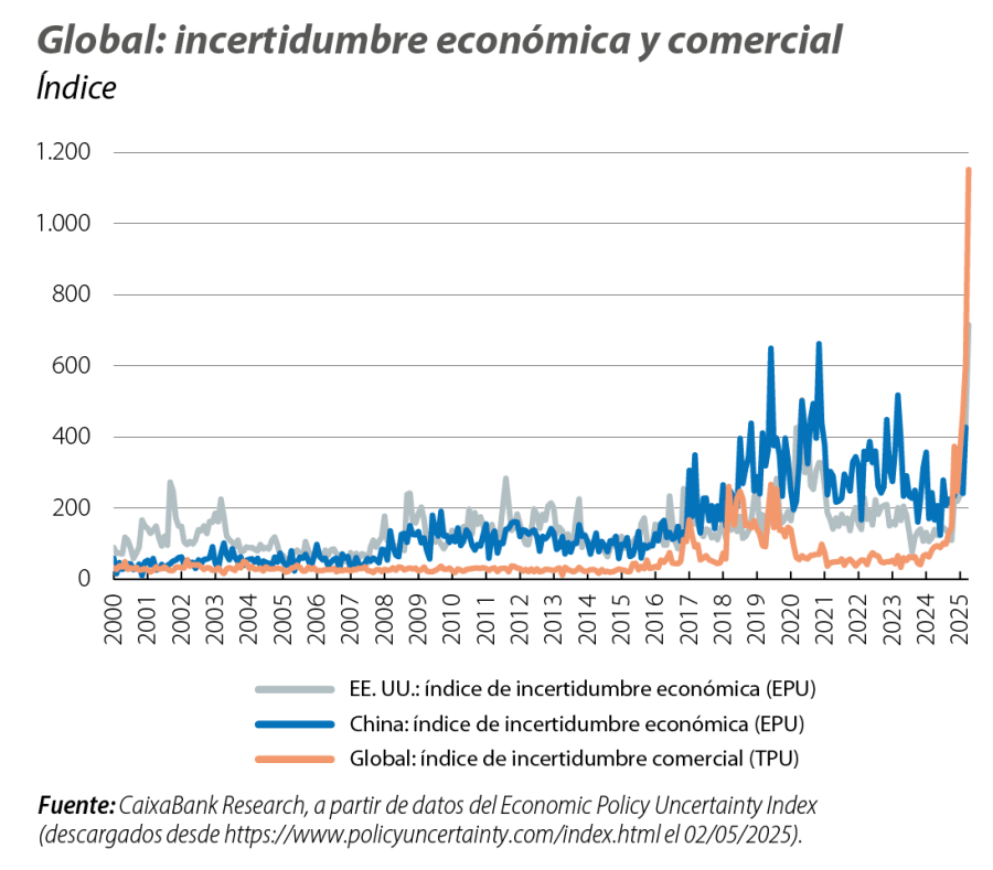 Por su coreografía y magnitud, el aumento de aranceles dictaminado por la Administración estadounidense seguirá teniendo implicaciones económicas a nivel global, así como derivadas en mercados financieros y en la confianza de los agentes. Por un lado, a pesar de haber suspendido su parte «recíproca» por 90 días, la Casa Blanca mantiene vigentes el suelo universal del 10% y los aranceles sectoriales específicos. Por otro, la escalada proteccionista con China no parece tener tregua a la vista. Por su parte, más allá de las turbulencias en los mercados financieros (véase la Coyuntura de Mercados en este informe), el aumento de la incertidumbre empezó a pasar factura a la confianza de los agentes. En EE. UU., aunque la actividad sigue aguantando, el sentimiento económico continúa deteriorándose. El PMI compuesto estadounidense bajó en abril, por la importante caída de los servicios, mientras que el sector de manufacturas se ha estabilizado. Destaca el deterioro de los subcomponentes de expectativas, sobre todo del lado de los servicios, en su nivel más bajo desde finales de 2022. Del lado de la confianza de los consumidores, el índice de la Conference Board tocó mínimos desde 2020 y el índice análogo de la OCDE muestra una tendencia de caída desde finales de 2024.
