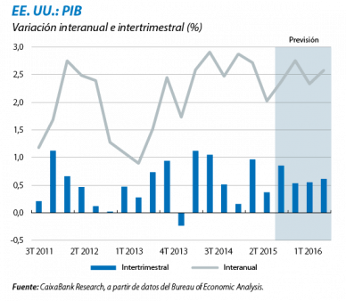 El PIB de EE. UU. desacelera su avance en el 3T 2015, aunque de manera temporal. Según la primera estimación realizada por el Bureau of Economic Analysis, la economía estadounidense creció un moderado 0,4% intertimestral en el 3T 2015 (un 2,0% interanual), frente al 0,6% del 2T. Un registro débil que se debió, sobre todo, a un ajuste puntual de las existencias, que sustrajo 0,4 p. p. al avance intertrimestral del PIB. La lectura para el resto de componentes, que marca la tendencia de medio plazo, es más favorable. El consumo privado avanzó un significativo 0,8% intertrimestral, tal y como venían apuntando los indicadores de confianza del consumidor; y la inversión no residencial avanzó un más moderado 0,5% intertrimestral. Por otra parte, en el componente del consumo público, el descenso del gasto de defensa quedó compensado por el aumento de otras partidas. La debilidad del avance, mayor de lo que preveíamos, nos lleva a efectuar una revisión a la baja en nuestra previsión de crecimiento para 2015, hasta el 2,5% (antes: 2,7%). De cara a 2016, también hemos revisado ligeramente a la baja nuestro escenario central, que ahora prevé un avance del 2,5% (antes: 2,7%), por un dólar que esperamos que sea más fuerte ante la ampliación del QE del BCE. Con todo, no cambia nuestra visión positiva de la expansión estadounidense, que se apoyará en el consumo, en la inversión (tanto empresarial como residencial) y en una menor consolidación fiscal. En este contexto de expansión se enmarca el mensaje de la Fed del mes de octubre, que refuerza la posibilidad del inicio de la subida de tipos en diciembre (coincidiendo con nuestro escenario central).