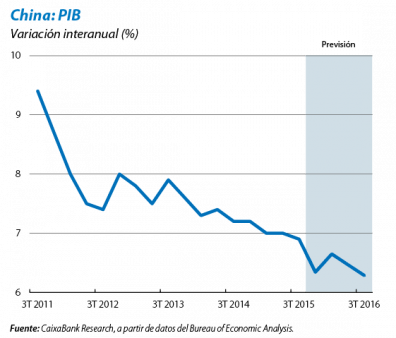En China, el PIB del 3T sorprendió al alza con un avance del 6,9% interanual, tan solo ligeramente por debajo del 7,0% del 2T. El avance, por encima de nuestras previsiones, nos empuja a efectuar una revisión técnica al alza de las previsiones de crecimiento del PIB de 2015 hasta el 6,8% (antes: 6,7%). Aun así, los riesgos a la baja siguen siendo elevados. Prueba de ello son las medidas que el Ejecutivo sigue tomando para apoyar el crecimiento, la más reciente, el nuevo recorte del banco central sobre el tipo de interés de referencia (de 25 p. b. hasta el 4,35%), el quinto recorte en lo que va de año. También rebajó el coeficiente de caja en 50 p. b. (hasta el 17,5% para la mayoría de grandes bancos). En paralelo, la autoridad monetaria anunció la suspensión del límite sobre la remuneración de los depósitos bancarios, lo que supone un paso más hacia la liberalización y modernización del sistema financiero. Precisamente, en el Plenario del Partido Comunista, que tuvo lugar a finales de octubre y en el que se esbozaron las líneas de actuación que debe seguir el país en los próximos cinco años (2016-2020), se volvió a mencionar la necesidad de reformas en el sistema financiero. También se decidió suspender la ley del hijo único, lo cual permite a las parejas tener dos hijos, y se hizo hincapié en la voluntad de mantener un crecimiento medio (del 6,5% para 2016), respetuoso con el medio ambiente y compatible con el cambio de modelo más sesgado hacia el consumo y los servicios.