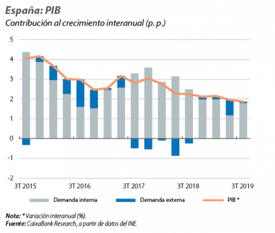 Una moderación gradual del crecimiento. Con los datos disponibles de tres de los cuatro trimestres del año 2019 que acabamos de cerrar, todo hace prever que el crecimiento de la economía se habrá situado en 2019 cerca del 1,9% anual, un ritmo más contenido que el del año pasado (2,4%) pero holgadamente por encima del promedio de crecimiento previsto para la eurozona (1,1%). Esta moderación del crecimiento se explica tanto por el desvanecimiento del impulso cíclico que ofrece la fase inicial de la recuperación económica como por el deterioro del entorno comercial global. Este último, producto de elementos como el pulso comercial entre EE. UU. y China, las incertidumbres relacionadas con el brexit y las dificultades que atraviesa el sector del automóvil a nivel europeo (por la introducción de nuevas regulaciones y por el cambio tecnológico que experimenta el sector) ha tenido un impacto sobre las exportaciones españolas de bienes y servicios por el canal de la demanda, pero no constituye una señal de merma de la competitividad en términos relativos. Así, la desaceleración que observamos representa, en gran medida, un proceso de convergencia del crecimiento hacia cotas más acordes con el crecimiento potencial de la economía. De cara al año que viene, prevemos que este proceso de convergencia tenga continuidad y que la economía crezca a tasas cercanas al 1,5%.