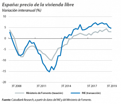 El precio de la vivienda crece en el 3T más de lo previsto. Los precios de transacción publicados por el INE crecieron un 1,6% en términos intertrimestrales (más que en los tres trimestres anteriores), aunque en términos interanuales se desaceleraron hasta el 4,7%. Si bien en el 4T pueden repuntar ligeramente debido a un efecto de base relacionado con el mal dato que se registró en el 4T 2018 (crecimiento intertrimestral del 0,4%), el conjunto de indicadores sigue apuntando a una tendencia de fondo de desaceleración, en consonancia con el menor ritmo de crecimiento de la economía.