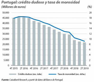 Los préstamos dudosos continúan disminuyendo. La tasa de morosidad del sector privado no financiero cayó hasta el 9,2% en el 2T, 0,7 p. p. menos con respecto al 1T y 9,3 p. p. menos con respecto al máximo registrado en el 2T 2016. Esta reducción se explica por las ventas de carteras de préstamos dudosos y el buen desempeño de la economía portuguesa, que favorecen unos menores niveles de impago. Específicamente, los préstamos dudosos disminuyeron en 851 millones de euros respecto al trimestre anterior, gracias principalmente al segmento de las sociedades no financieras (–653 millones de euros). No obstante, la tasa de morosidad en este segmento continúa siendo elevada (16,6%). Por otra parte, la cartera de crédito del sector privado continuó contrayéndose en agosto (–1,4% interanual), lo que se explica por la contracción de la cartera de crédito a las sociedades no financieras (–2,9% interanual) y del crédito a las familias (–0,5%).