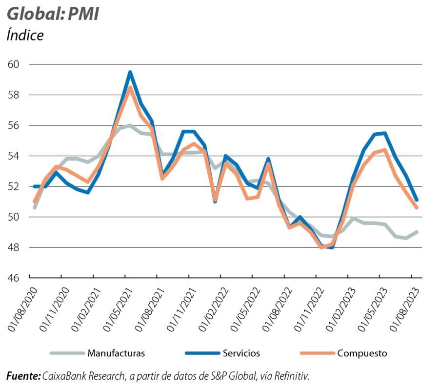 Así lo recoge el índice PMI compuesto global, que se sitúa en los 50,6 puntos en agosto, su nivel más bajo desde enero (49,7 puntos), empujado principalmente por la pérdida de fuelle del sector servicios, que acumula tres meses consecutivos de fuertes descensos, desde los 55,5 puntos en mayo hasta los 51,1 en agosto. Por un lado, algunas grandes economías emergentes (como Brasil, Rusia, India y China) han registrado recientemente mejoras del lado del sector manufacturero. Sin embargo, la eurozona sigue presentando una debilidad particularmente visible y persistente. De hecho, a pesar de la mejora del PMI compuesto de la eurozona en septiembre, todavía se mantiene en zona de contracción (subió 0,5 puntos, hasta situarse en el 47,2), presionado por la fragilidad del sector manufacturero (–0,1 puntos, hasta 43,4) y la falta de impulso en los servicios (+0,8 puntos, hasta 48,7). Las dificultades del sector manufacturero europeo quedan también reflejadas en los PMI de sus dos mayores economías: en Francia, cayó en septiembre hasta un mínimo desde el inicio de la pandemia (–1,8 puntos, hasta 44,2) y en Alemania, a pesar de la recuperación, se mantiene en territorio ampliamente contractivo (+0,5 puntos, hasta 39,6).