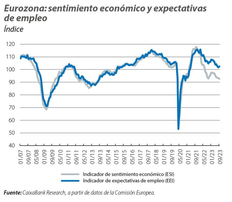 El índice de sentimiento económico (ESI) de la Comisión Europea para la UE cayó hasta los 92,8 puntos (frente a un promedio histórico de 100 puntos), un nuevo mínimo desde agosto de 2020, lo que remarca la debilidad económica del conjunto de la economía europea. Sin embargo, el índice de expectativas de empleo (EEI) se ha mantenido significativamente por encima, en concreto unos 10 puntos en el último año (frente a una diferencia prácticamente nula en el periodo prepandemia). Eso sí, en los últimos meses compartió la misma tendencia de descenso del ESI, que se situó en septiembre en los 102,4 puntos. Por otro lado, la economía también seguirá condicionada por la política fiscal, ya que los Estados miembros deberán empezar a normalizar sus políticas fiscales, teniendo en cuenta la reactivación de las reglas fiscales europeas en 2024. Precisamente, aunque sigan las negociaciones entre los Estados miembros, se espera que el nuevo marco fiscal europeo mantenga las metas fiscales vigentes (como el objetivo del déficit al 3,0%), aunque se ofrezca un mayor control a nivel nacional acerca de cómo cumplir dichos objetivos, por ejemplo, mediante la elaboración de planes plurianuales.