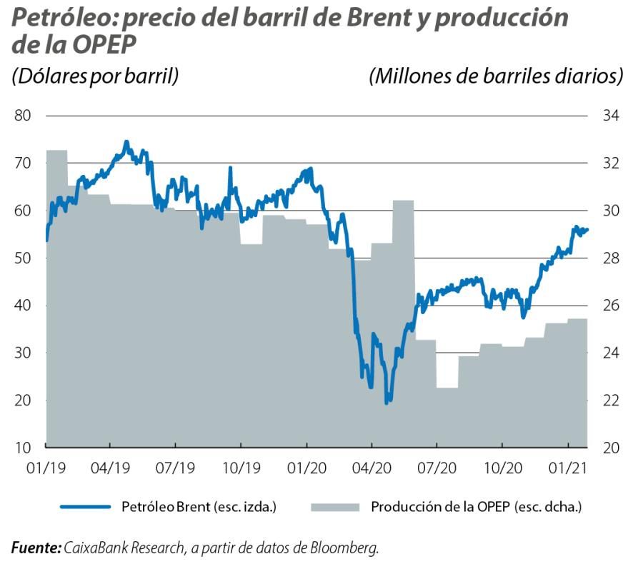 Ante la perspectiva de que el crecimiento económico sea contenido en el 1T, la OPEP y sus aliados (OPEP+) decidieron posponer el aumento de producción de 2 millones de barriles diarios (mbd) previsto anteriormente para inicios de 2021. Tras la reunión mantenida el 5 de enero, se acordó que Rusia y Kazajstán aumentaran ligera y gradualmente su producción hasta marzo (+0,15 mbd en conjunto) y que Arabia Saudí la recortara voluntariamente en 1 mbd. Así, la OPEP+ no solamente no aumentó la producción para el 1T 2021, sino que en su conjunto la recortó. Este respaldo del cártel aisló el precio del barril de Brent del deterioro en el sentimiento económico e inversor y favoreció que este, de hecho, aumentara casi un 8% en el conjunto del mes, hasta los 55 dólares.