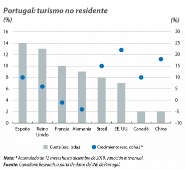 La actividad turística aceleró en 2019. El año pasado, Portugal registró un total de 27 millones de turistas, de los cuales 11 millones fueron nacionales y 16 millones, extranjeros. Ello representó un incremento de la actividad turística del 7,3% en 2019 (5,3% en 2018), con un aumento del número de turistas internacionales del 7,1% (4,8% en 2018). Los turistas procedentes de España, EE. UU. y Brasil fueron los principales responsables de esta dinámica y representaron más de la mitad del crecimiento total de los turistas extranjeros. Por su parte, el ingreso promedio por habitación disponible aumentó nuevamente en 2019, situándose en los 49,4 euros (48,5 euros en 2018) y los ingresos de los establecimientos de alojamiento turístico crecieron un 7,3%. Si estas tendencias continuaran, Portugal podría superar los 17 millones de turistas internacionales en 2020. Sin embargo, el turismo será, probablemente, uno de los sectores más penalizados por la emergencia sanitaria del coronavirus.