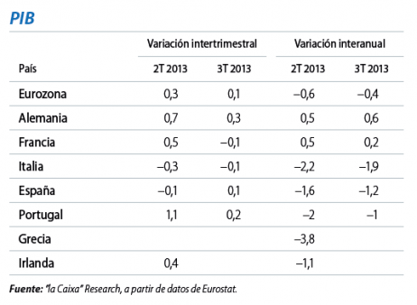 Mejora de la actividad en los países periféricos. Italia moderó su ritmo de caída pero no consiguió abandonar la recesión. La pérdida de competitividad y la falta de reformas auguran una reactivación de la economía italiana menos vigorosa que la del conjunto de la eurozona. Las perspectivas son algo mejores en España: tras nueve trimestres de contracción, el PIB creció un 0,1% intertrimestral. También los registros que presenta la economía portuguesa son relativamente esperanzadores. Tras tres años de contracción económica, en 2T el PIB sorprendió con un avance del 1,1% intertrimestral (–0,4% en 1T). En 3T el avance se situó en el 0,2%, una cifra más acorde con la capacidad de crecimiento de Portugal a corto y medio plazo.