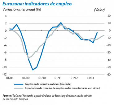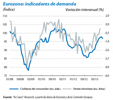 La demanda interna se suma al proceso de recuperación. El buen comportamiento de las ventas minoristas en 3T indica que el consumo poco a poco puede ir ganando protagonismo. Si bien los datos de noviembre de confianza del consumidor son un poco más flojos, todavía se sitúan por encima del nivel de 3T y no hay motivos para pensar que no retomarán la tendencia ascendente mostrada durante los últimos meses. La mejora de la demanda interna también se está haciendo palpable en la inversión. Según las encuestas de sentimiento económico que elabora la CE, las empresas del sector manufacturero de la eurozona esperan que la inversión crezca un 3% el próximo año. Ello contrasta con las expectativas que tienen para el conjunto de 2013, de un caída del 3%. Tanto el consumo como la inversión ya presentaron tasas de crecimiento intertrimestrales positivas en 2T 2013, del 0,1% y 0,2% respectivamente, pero la mejora que se ha producido en los indicadores mensuales desde entonces permite ser relativamente optimista.
