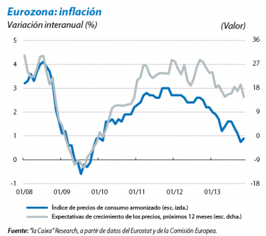 La inflación repunta y aleja los temores sobre el riesgo de deflación. En línea con lo esperado, la inflación aumentó dos décimas y se situó en el 0,9% en noviembre, interrumpiendo así tres meses de descensos. Este cambio de tendencia estaba previsto en nuestro escenario ya que el descenso de la inflación de los últimos meses se explicaba sobre todo por factores transitorios (caída del precio del petróleo y de los alimentos no elaborados). En la medida en que estos efectos sigan perdiendo peso y que la recuperación de la demanda interna se vaya consolidando, la inflación irá ganando terreno. De todas formas, los importantes esfuerzos que varios países de la eurozona están llevando a cabo para seguir ganando competitividad mantendrán la tasa de inflación en niveles moderados. En este sentido, las encuestas de opinión de la CE sobre las perspectivas de inflación en los próximos meses son bastante estables y no presentan una tendencia clara. La actuación sorpresa del BCE del pasado noviembre, cuando rebajó el tipo refi hasta el 0,25%, debe ser interpretada como una nueva muestra de compromiso por parte de la máxima autoridad monetaria con un escenario macroeconómico en el que el crecimiento de los precios sea cercano al 2%.
