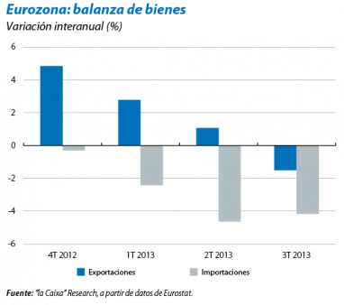 Las exportaciones sorprenden con una evolución más pobre de lo esperado. Durante los últimos años, el sector exterior ha sido la principal fuente de crecimiento de la actividad económica de la eurozona. Ya se esperaba que su contribución a la recuperación iría remitiendo a medida que las importaciones respondieran a la recuperación de la demanda interna. Pero la notable desaceleración del crecimiento de las exportaciones que se ha producido en los últimos meses ha sorprendido negativamente. Concretamente, en 3T las exportaciones cayeron un 1,5% en términos interanuales, hecho que contrasta con el incremento del 8,2% anotado en 3T 2012. Parte de esta desaceleración podría ser resultado de la caída de las perspectivas de crecimiento en los países emergentes que se produjo este verano cuando se anticipó el inicio del tappering para septiembre. Sin embargo, esta caída en las perspectivas de crecimiento de los emergentes ya se ha corregido y los pedidos de exportación siguen mostrando una tendencia favorable. Por tanto, la pérdida de dinamismo de las exportaciones debería ser temporal.